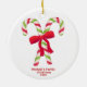 Personalized coffee cup ornament with candy cane stripes, perfect for holiday gifting. [Alt-text: Round ceramic ornament featuring red/white candy cane swirls around a coffee cup design.] Customize with names/dates for a unique keepsake. Ideal for coffee lovers, DIY decor ('make your own ornament'), or festive tree trimming. Durable ceramic, vibrant colors, fast shipping. A sweet handmade gift for friends, family or coworkers!