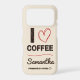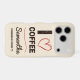 This stylish phone case features the phrase “I ♥ Coffee” with bold lettering and a fun coffee bean design. Add a custom name to make it unique and personal.