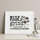Forget rise and shine. If it's more like "rise and grind" in your house, hang our unique personalized art print in your coffee area or kitchen! Vintage style design features "Rise & Grind" in trendy black typography with three coffee bean illustrations in espresso brown. Personalize with your year established and family name. "Coffee Roasters" text is customizable as well. Makes a great gift for new homeowners or anyone who loves to grind their own coffee or espresso beans!