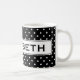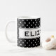 Personalized coffee mug with polka dots. Cute monogram gift idea for women. Black and white polkadots pattern design. Customizable background color.