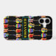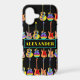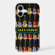 Let your guitar player teen rock out in style with this personalized guitar phone case featuring a bold psychedelic pattern of electric, acoustic, and semi-acoustic guitars in vibrant shades of blue, orange, yellow, purple, green, and red on a sleek black background.