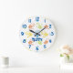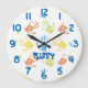 Personalize this clock with a name. Little hands are colorful in yellow, orange, blue and green. Numbers are in blue.