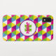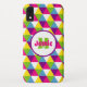 This cell phone case has a colorful pattern of triangles in bright yellow, green, pink, blue, and white. Customize the white and purple circle with your name, initials, monogram, or other wording. Make the circle and name as big or little as you like, or remove it completely.