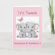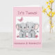 Celebrate the arrival of twin baby girls with this adorable and customizable greeting card! The front features two sweet little elephants and the message "It's Twins", with space to personalize the card with the twins' names.