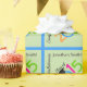This brightly colored gift wrapping paper features a graduation design. Customizable text reads: Congratulations (personal name)! and Class of 2015 with a mortarboard sitting on top of the "0". The background is light green and bright blue. This wrapping paper is accented with orange, blue, pink and lime green.