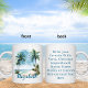 Personalized Custom Bible Verse Beach Landscape Coffee Mug - A beautiful and meaningful gift for her. Featuring a bright and uplifting beach ocean scene with palm trees and sand. Customize by adding your favorite Bible Verse, Inspirational Quote or Hymn Stanza. Perfect as a birthday gift for Christian women.