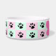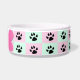 This adorable personalized custom female dog bowl features paw prints in a checkerboard design in alternating pink and green squares with a pretty pink dog bone on top. The dog bowl becomes a custom girl dog bowl when you personalize it with the name of your dog. Copyright Kathy Henis