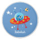 For the lover of all things alien and UFOs, a cute cartoon illustration of an alien flying around the universe in a spaceship, with a planet and stars in the background. Customize the text for the name of your own extra-terrestrial being.