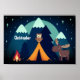 This Camping poster features a tent, campfire, an owl and moose all under a stary sky with a full moon and mountains in the background.