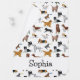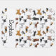 A design for little dog lovers. It features illustrations of golden retrievers, border collies, Jack Russell terriers, spaniels, basset hounds, beagles, Dalmatians, golden doodles, Labrador retrievers, and mixed breeds. Personalize with the name of your choice, which will appear in a fun, black font.