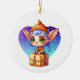 Adorable little elf holding a Christmas present with a cute hat on personalized Christmas ornament.