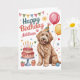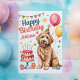 This adorable personalized goldendoodle birthday card design includes a cute watercolor goldendoodle dog graphic, as well as a birthday cake and birthday decorations. The front of the birthday cards includes a place where you can personalize with your name as well as the words "Happy Birthday". The message on the inside of the card says "Hope your birthday is paws-itively amazing!"