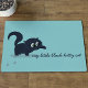 A cute little black kitty cat feeding placemat with space for you to add your fur baby's name. It's double sided with a classic teal and white paw print pattern. It's also a great gift for any cat lover!