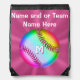 Super Cute Colorful Personalized Softball Drawstring Backpack for Girls with Your Text or Delete. Metallic look rainbow softball backpack on pink burst. CLICK "More" to see the two text boxes to type in YOUR NAME and or TEAM NAME and MONOGRAM or her JERSEY NUMBER. You can just Delete unwanted text too. Call me, Linda, for changes or help: 239-949-9090.
