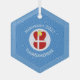 Hanukkah decor hexagon shaped glass ornament for the holiday season shows an angel wearing the red and white flag of Denmark. Designed for families of multiple religions, the Hanukkah Danish angel is found in the center of white squiggly squares, surrounded by blue squiggly squares. Add a name to personalize. Customize by adding the year. Or, add your own text.