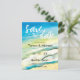 Featuring an original watercolor painting that beautifully blends hues of blues, turquoise, and yellows, this postcard transports your guests to a serene tropical paradise. The dreamy beach scene sets the perfect tone for your upcoming wedding, promising an unforgettable experience.