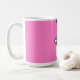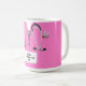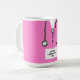 Creative doctor appreciation, birthday or graduation gift mug, featuring pink hospital scrubs and ID tag illustration. To personalize edit text to add name.