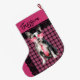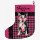 Featuring an adorable Boston Terrier wearing pink heart sunglasses on a pink tartan background with a stylish black lace border, this stocking combines festive charm with a quirky, fashionable twist.