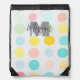 This stylish and customizable drawstring bag features a vibrant polka dot pattern in pastel colors, including green, pink, blue, yellow, and peach. The center of the bag showcases a large gray letter "M" with the name "Morgan" written in a cursive font, making it a perfect personalized gift or accessory. The bag has black drawstrings and reinforced black corners, ensuring durability and a trendy look. Ideal for carrying gym clothes, school supplies, or everyday essentials.