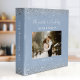 An elegant binder album for your wedding photos. Personalize it with your favorite photo and the names of the couple in white handwriting script and serif fonts on a dusty blue background, with silver faux glitter borders at the top and bottom. "Our Wedding Day" or other wording of your choice appears on the spine.
