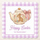 Personalized Easter Bunny Teapot Gingham Family Paper Coaster. Celebrate Easter with this charming and whimsical design. Features an adorable bunny beside a vintage style teapot with a sweet pink bow and delicate spring flowers. Little Easter eggs complete the festive scene. The design is beautifully framed by a classic light purple and white gingham check border, adding a touch of rustic charm. Easily personalize with your family name for a unique touch.