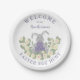 Welcome guests in charming style with this personalized “Welcome” Easter bunny egg hunt paper plate, perfect for a spring garden party or Easter brunch. The design features a sweet hand-illustrated bunny holding a large purple spotted Easter egg while sitting among fresh spring foliage and cheerful daisies for a bright, seasonal look.