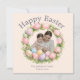 Celebrate Easter in style with this beautiful, customizable greeting card! Featuring a delicate wreath of pink tulips, pastel Easter eggs, and fresh spring flowers, this card adds a warm, personal touch to your holiday wishes. Perfect for families, this card allows you to include your own family photo and name, making it a memorable keepsake for Easter 2026. Ideal for sending love and joy to friends and relatives.