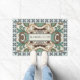 An elegant doormat featuring your nameplate overlay on a beautiful pattern of flourished geometric shapes in greens, cream, tan, blue. An eye catching character filled flowery entryway doormat reminiscent of ancient mosaic tiles.
