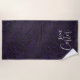 Elegant purple black leopard beach towel with customizable typography in trendy script font and personalized with your name.