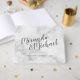 featuring personalized bride and groom's name in grey modern script with title and wedding date in grey modern sans serif font style on white marble background.