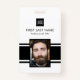 Personalized business office ID badge featuring a black and white background, a photo of the employee, your company logo, name and profession.