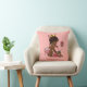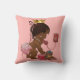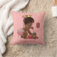 Personalized elegant vintage ethnic little princess pink throw pillow. A beautiful vintage illustration of a cute and adorable African American baby girl with stylish pink diaper, pearls, ribbons and gold crown. She is talking on an old red retro telephone telling you that she is on her way! She is holding a little pink suitcase and her quirky teddy bear is leaning against it - she's all packed up and ready for her arrival! The background is a pretty pink with dark pink customizable text. Chic, trendy, fun, fashionable, funny, amusing, humorous, whimsical, feminine, personalized / personalised custom cushion. A cute baby shower gift or new baby girl gift. If you need any assistance customizing your product please contact me through my store and I will be happy to help.