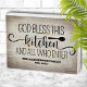 Welcome all your guests with this custom sign featuring a fun greeting and your family name. "God bless our kitchen and all who enter"