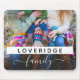 Custom mouse pad personalized with your photo and family surname. Your custom name is written in an uppercase black font with a white background, and the word "family" is written in an elegant hand lettered font script with curly swashes. Click "Personalize" to add your family name monogram and a large photo of your family. Click "Click to customize further" to change the font and text color. A custom mouse pad makes a great gift for family and friends!