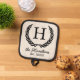 Discover a distinctive pot holder adorned with a sophisticated black typography and calligraphy script on a cream white fabric, customizable with your couple's names and family surname in a black typography style on a cream ivory background. Add your family's founding date to create an item as unique as your collective story. This attractive, decorative, and stylish design suits both the home baker and the professional chef equally.