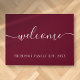 Elegant personalized family name doormat featuring your family name with your established date set in a classic white text on a burgundy background with the message "welcome" that is set in an elegant white script text. Personalize with your details and customize the color to the color of your choice. Designed by Thisisnotme©