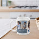 This simple modern personalized photo mug design with dusty blue accents puts your favorite photos front and center. Customize with six photos of friends, kids, grandchildren, pets, or your favorite places, then personalize with a single initial monogram, your family name, and year established.