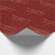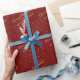 Personalized Christmas wrapping paper with your family name and custom text in gold on red paper with gold sparkly glitter snowflakes. Click 'customize further' to change the background color or fonts to design your own unique wrapping set.