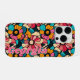 Retro-style floral pattern with bold color flowers in pinks, oranges and turquoise is a fun background for your phone case. Personalize with your name in pink with a bold, retro 70's style typeface.