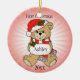 A sweet female teddy bear on a red starburst background with customizable name & date on front and back. Font and color of text can also be changed.