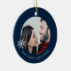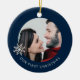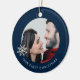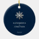 Celebrate a special milestone with this Personalized First Christmas ornament. Cherish your first holiday together as a couple with this exquisite ornament featuring a customizable photo framed by a delicate snowflake on a rich navy blue background. The front elegantly displays 'Our First Christmas' in the lower thirds, capturing the magic of the moment. Turn it around to find the snowflake-adorned back, ready to be personalized with your names and the memorable year. This unique ornament is a perfect addition to your tree and a wonderful keepsake to mark your journey together.