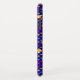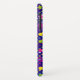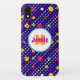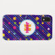 This navy blue cell case cover has colorful patterns of random circles that are overlaid by diagonal dashed lines in bright yellow, orange, purple, green, burgundy, hot pink, light blue, and white. Customize the white and blue circle with your name, initials, monogram, or other wording. Make the circle and name as big or little as you like, or remove it completely.