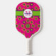 You'll be all the rage on the pickleball court when you're sporting one of these personalized funky circles pickleball paddle with monogram in bright colored circles with rings around them in colors of neon green, yellow, burgundy, and navy blue on a hot pink background with a neon green and navy band across the top with a white and burgundy circle overlay that is personalized with your name and monogram in navy and pink. Email niteowlstudio@gmail.com with any request for changes.