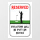 Personalized Funny Golf Parking Sign. This modern and trendy golf parking sign is perfect for any golf fan or golfer. Featuring the humorous text "Reserved" "Violators Will Be Putt On Notice" and a silhouette of a golfer putting on a green, this sign makes a great gift for dad, grandpa, or any golf enthusiast. Ideal for birthdays, Father's Day, or as a Christmas present, this elegant and fun design adds a touch of humor to any space. Whether for a golf course or a hobby room, this personalized sign is a cool and cute way to show love for the sport. Customize it with a name to make it a unique and special gift.