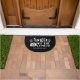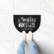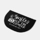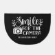 This humorous doormat features text image "Smile For The Camera" and personalized with your family name on a black background.
