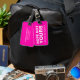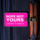 Personalized humorous travel bag tag featuring a fuschia pink background, the words "nope not yours", your name and contact details.