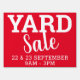 Personalized yard sale sign featuring a red background that can be changed to any color, the date, and time.