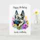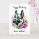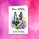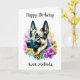Ai art depicting a cute German Shepherd surrounded by pink and yellow flowers personalized birthday card. Funny German shepherd birthday pun.