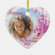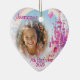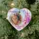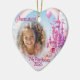 Beautiful personalized ceramic heart ornament decoration family photo keepsake of little girls birthday to hang on the wall and on the tree every year. Personalize it with a photo of your child and her name, keep a record of her as she grows up to hang on the tree. Pink 2 sided print