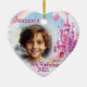 Beautiful personalized ceramic heart ornament decoration family photo keepsake of little girls birthday to hang on the wall and on the tree every year. Personalize it with a photo of your child and her name, keep a record of her as she grows up to hang on the tree. Pink 2 sided print